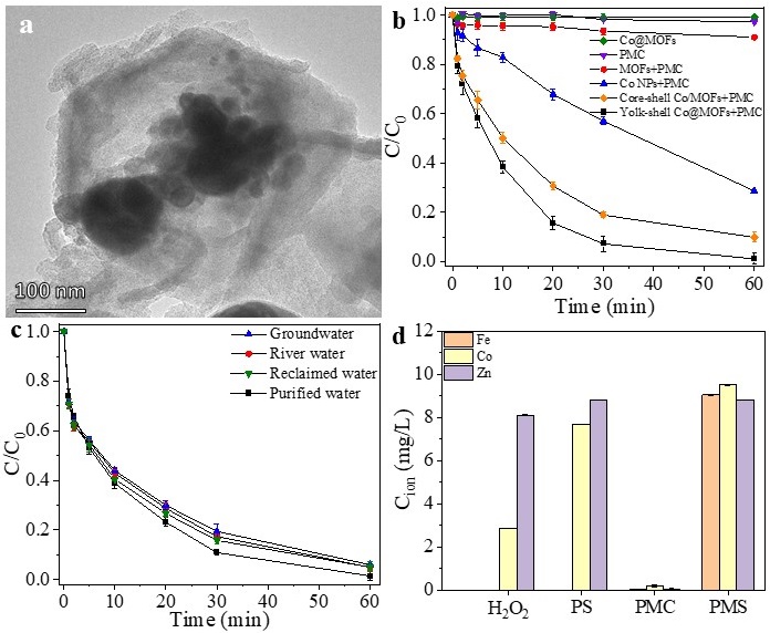 使用溶剂热合成法,通过控制反应时间,制备卵壳结构的Co@MOFs和核壳结构的Co/MOFs。Co@MOFs的Co纳米颗粒被多面体MOFs结构包覆,核与外壳中间存在不规则的纳米空腔(图5a)。Co@MOFs可以限域催化PMC,抗生素和活性物质的反应发生在纳米空腔中。相比于Co/MOFs,限域空间有利于提高活性物质的反应效率,提升抗生素降解效果(图5b)。MOFs外壳的纳米级孔径有利于反应物和产物的快速传质,并对大分子化合物有尺寸排阻效应,避免其对活性物质的淬灭作用,在实际水基质中,Co@MOFs活化PMC降解SMX的降解效率可以保持在94%以上,而且相比于均相体系,降解速率受影响更小(图5c)。此外,MOFs外壳的包裹还可以有效防止Co纳米颗粒的团聚,结合PMC体系的弱碱性特征,该体系能有效抑制Co离子的泄漏(图5d)。